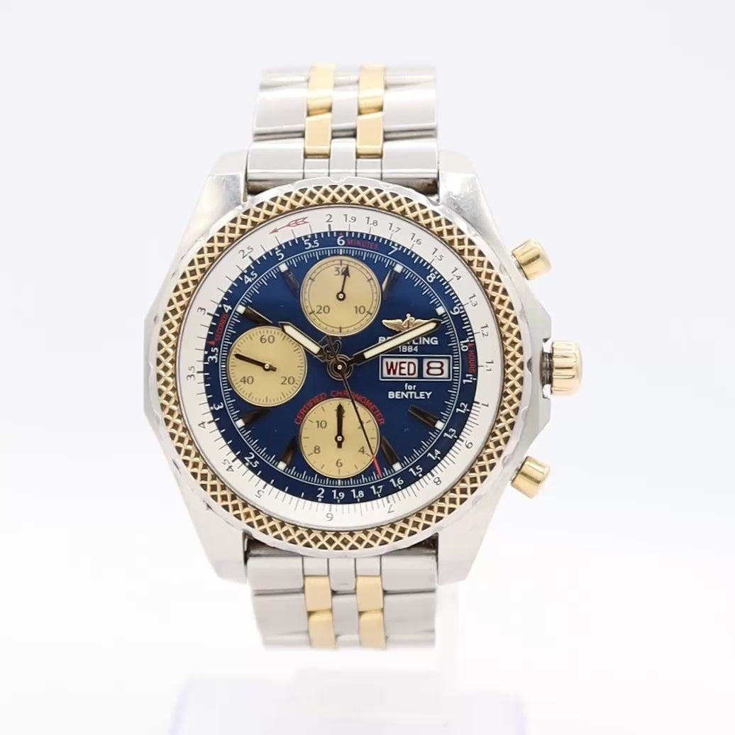 • Additional Information: The Breitling reference D13362 is a two-tone edition of the Breitling for Bentley GT chronograph watch, featuring a stainless steel case and an 18k yellow gold bidirectional rotating bezel and crown/pushers. This model is part of the collaboration between Breitling and the luxury automaker Bentley. Crown does not screw down.