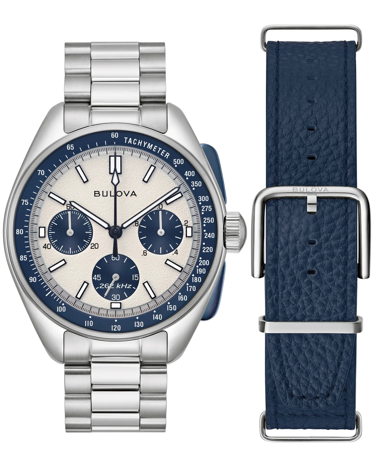 • Additional Information: Bulova Lunar Pilot chronograph from the Archive Series, features the same 43.5mm silver-tone stainless steel case as the original Bulova chronograph. Slim, blue chronograph pushers and a crown featuring the Bulova tuning fork logo are positioned at 3 o’clock. Under the flat sapphire crystal, the six-hand chronograph dial is rendered in a blue-and-silver panda design, with a blue tachymeter ring and retro Bulova name