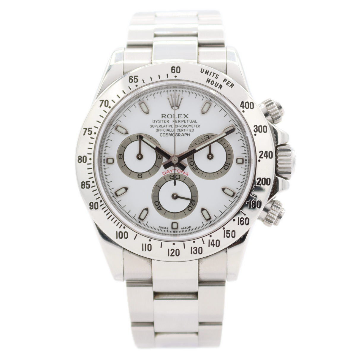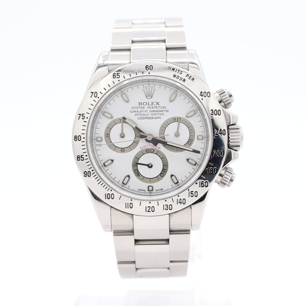 A Rolex Daytona 116520 stainless steel chronograph, powered by Rolex’s in-house automatic caliber 4130 for precision and reliability. Features a 40mm case, Oyster bracelet, and classic chronograph subdials, perfect for both daily wear and motorsport timing. COSC-certified with screw-down pushers for 100 m water resistance, this Daytona is a modern icon in Rolex’s storied chronograph lineup. A collectible timepiece that combines timeless design with legendary performance.