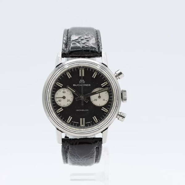 • Additional Information: This Bucherer with Landeron 248 is a vintage wristwatch that combines a Bucherer brand case with a manual-winding Landeron 248 chronograph movement. This movement is known for its 1960s popularity, two-button operation, and function as a cam-switched chronograph with a 30-minute register at 3:00 and a running seconds subdial at 9:00. This model features a stainless steel case and a 35mm diameter.