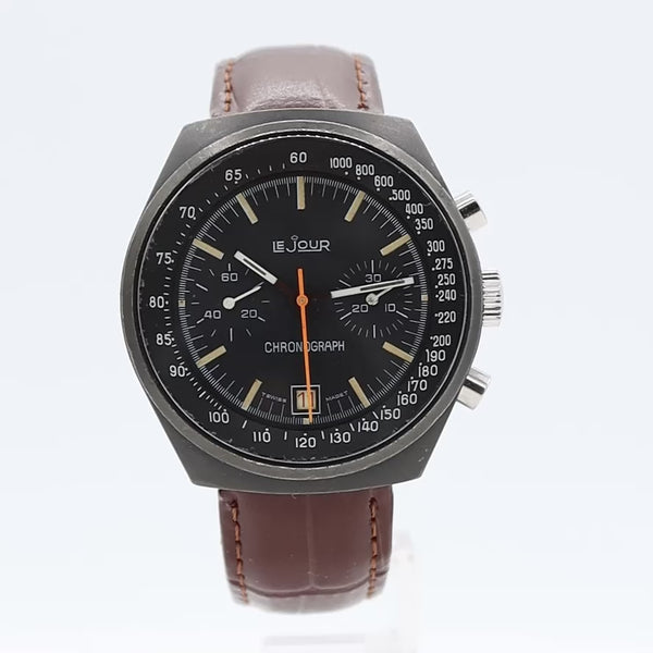 Additional Information: As with other vintage Le Jour chronographs, the 14030 is a classic, sporty tool watch that encapsulates the racing aesthetics of the "golden era" of mechanical chronographs. Its design offers a combination of bold functionality and timeless appeal that is highly sought after by collectors