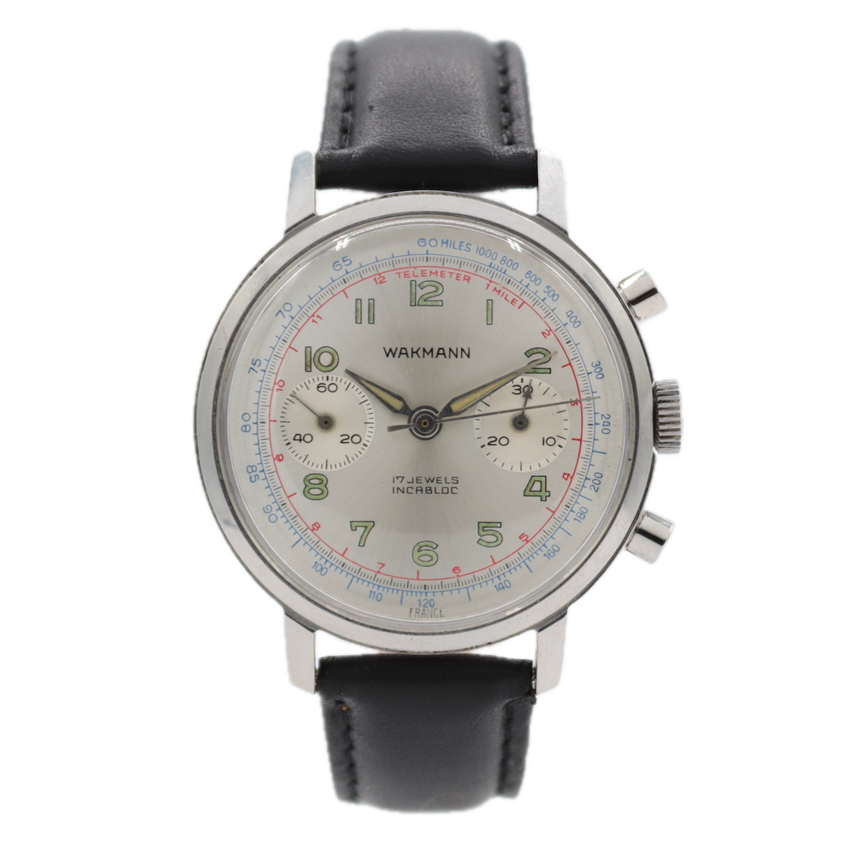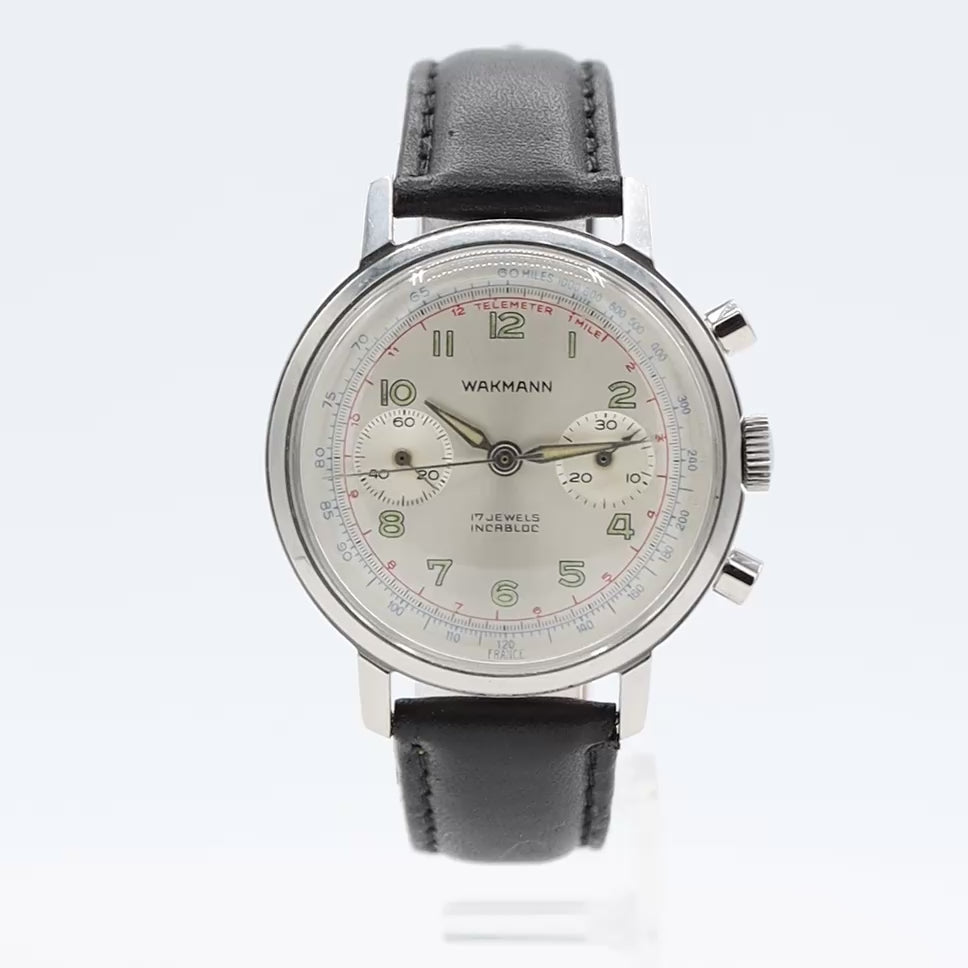 - Additional Information: Produced from 1937 to 1970, The Landeron 149 features a conventional two-pusher design, with the top pusher for start and stop and the bottom pusher for reset. Includes a 60-second and 30/45-minute chronograph, sub-second display, and cam switching mechanism. Also features "jumbo" 37.5mm case which was considered large for the era.