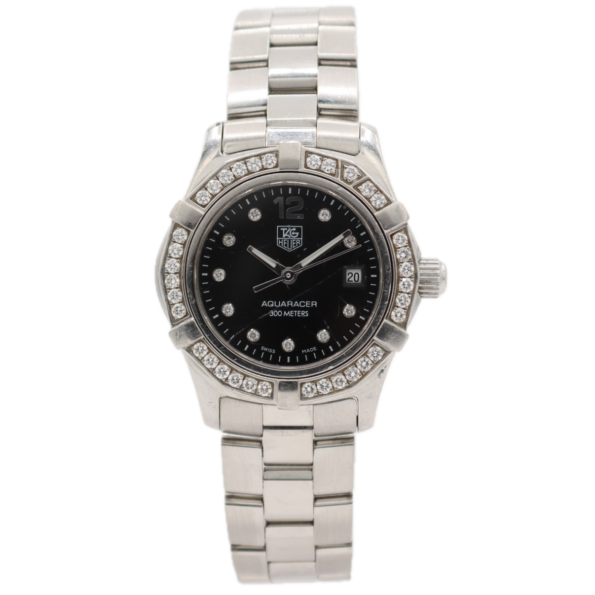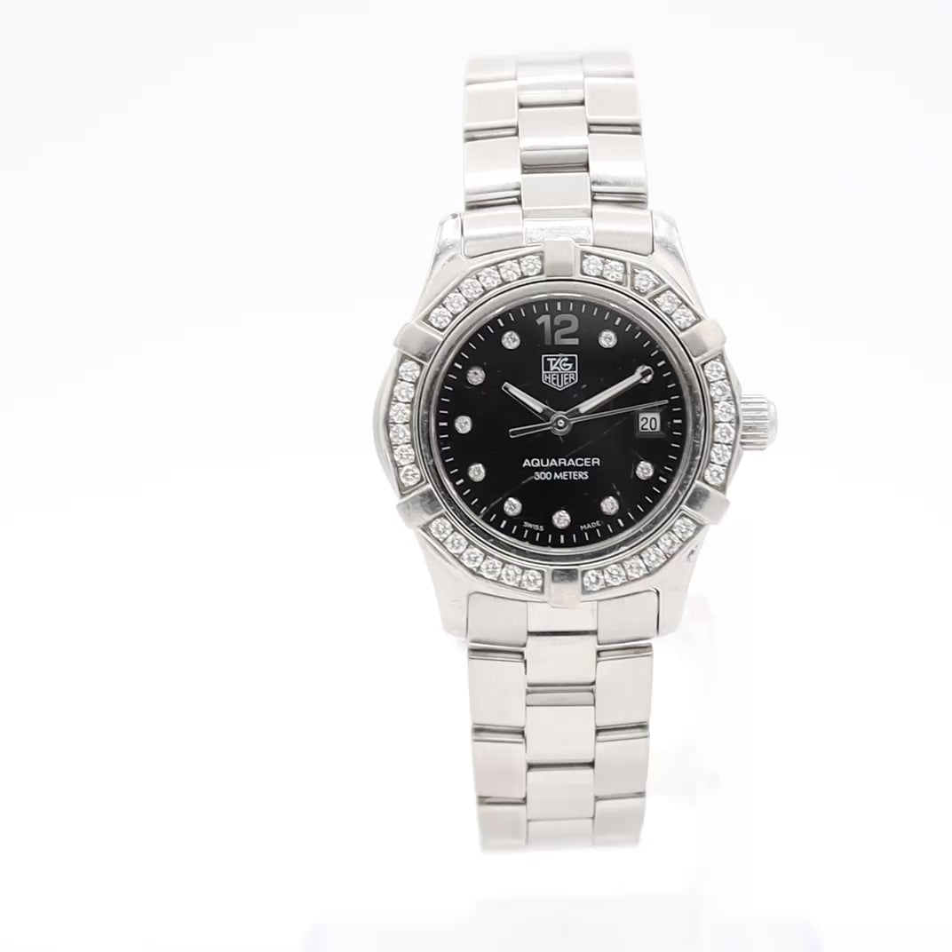 The TAG Heuer Aquaracer 300M (WAF141D.BA0813) is a luxury women's dive watch known for its combination of high-end jewelry accents and professional-grade performance. This specific model, famously advertised by Maria Sharapova, features a unidirectional rotating diamond-set bezel with 35 pave-set diamonds (approx. 0.55 ct) and diamond hour markers on a sleek black dial.