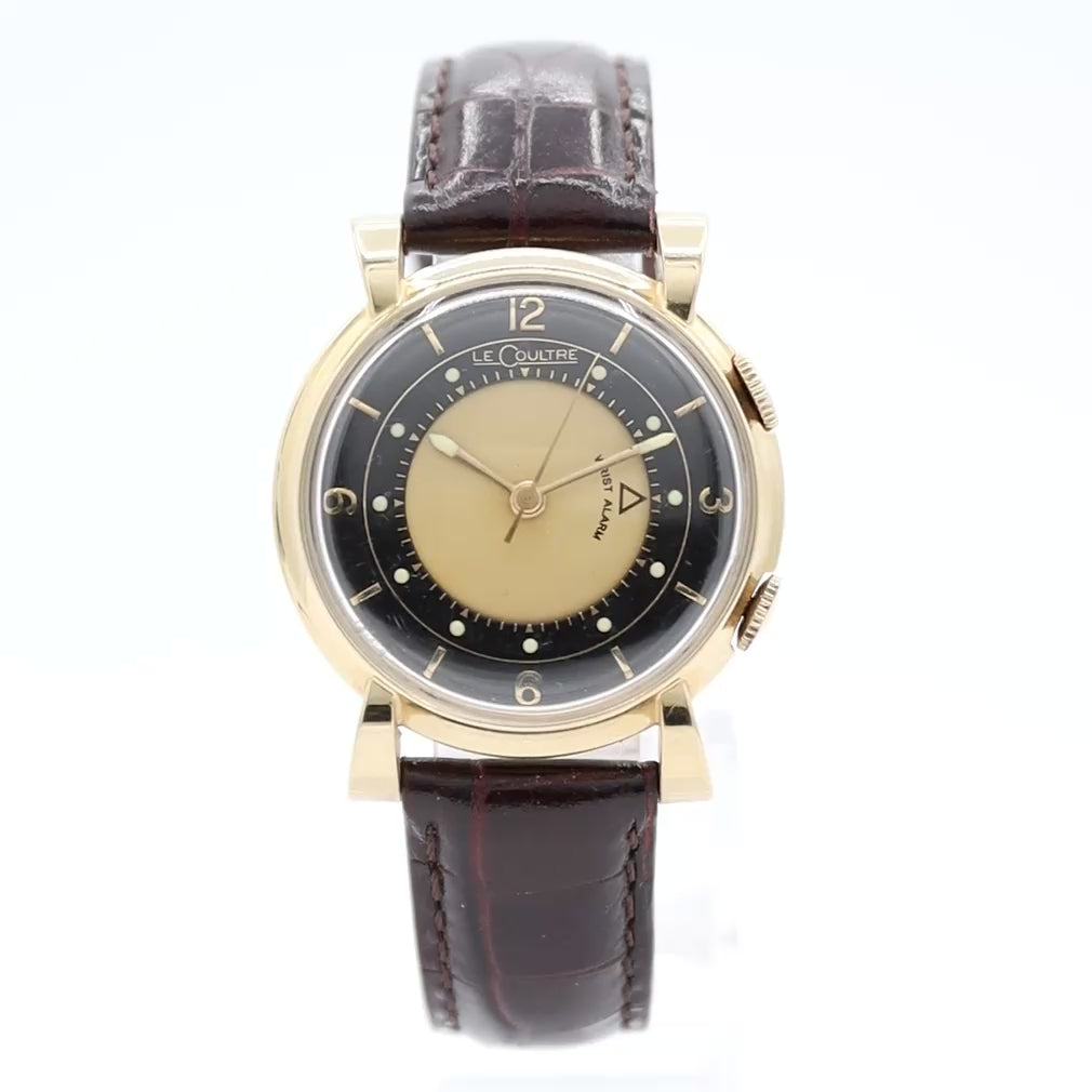 A vintage LeCoultre Memovox Ref. 3151 from the 1950s, powered by the manual-wind Caliber 489/1 mechanical alarm movement. Housed in a gold-filled case, this classic two-crown design features a striking black and gold-tone dial with no date complication, preserving its clean mid-century aesthetic. The mechanical alarm produces the distinctive vintage Memovox buzz that defined Jaeger-LeCoultre’s pioneering wrist alarm watches. A refined and highly collectible example of early Memovox craftsmanship from the golden era of Swiss watchmaking.