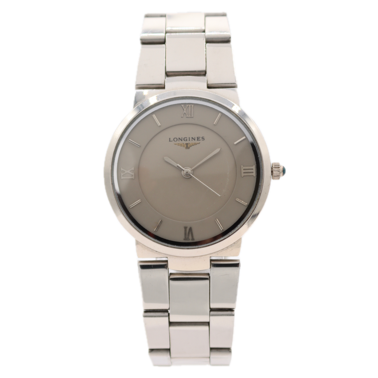 - Additional Information: The Longines with grey dial and stainless steel bracelet is a vintage, extra-thin dress men's quartz watch featuring a sapphire crystal.