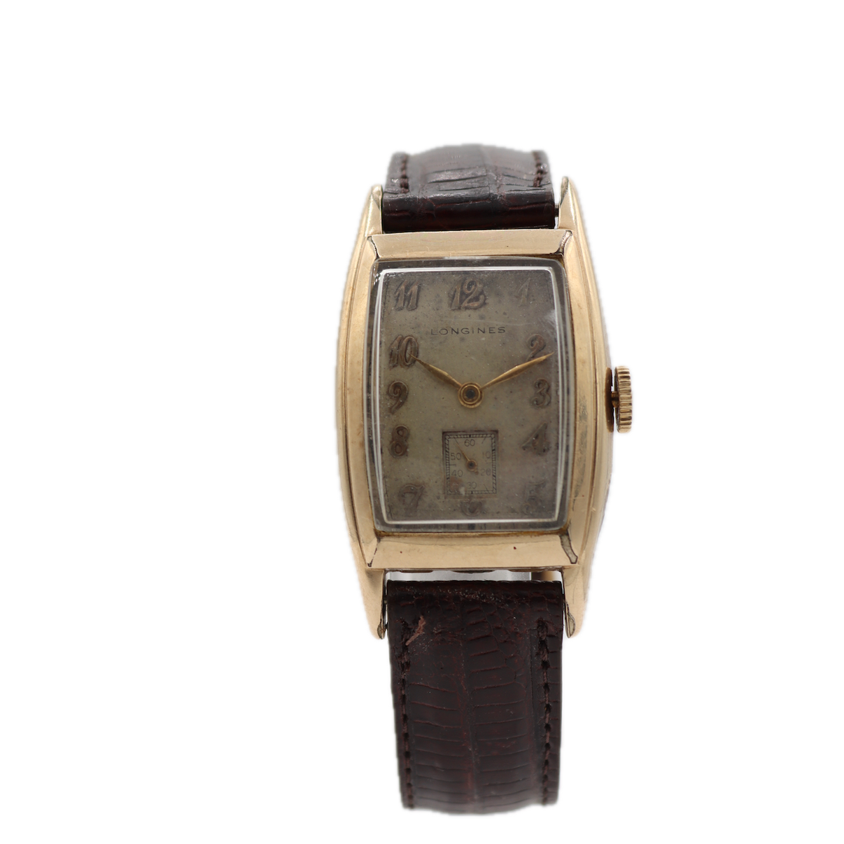 Fair, overall condition for its age. Running, but we dont know the last time it was serviced. This means, it can run unreliably, start or stop and timekeeping is not guaranteed. There is discoloration and scratches on the case. There are scratches on the crystal. The dial has scratches and discoloration. There is discoloration on the dial. The band is not original. Crystal is loose and not firmly set in case. Winding and setting are smooth.