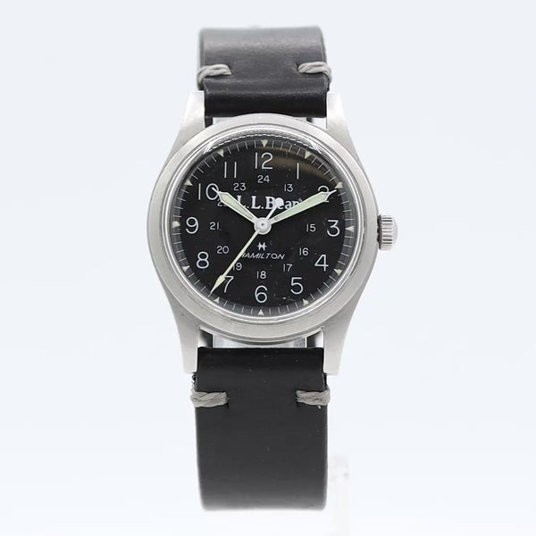 Additional Information: Hamilton reference 9219 is a vintage Khaki field watch produced in collaboration with L.L.Bean during the 1980s. These watches are sought after as a classic example of "horological Americana" and a civilian version of Hamilton's military-issue timepieces. Featuring a classic military-style matte black dial with white Arabic numeral indices (1-12) and an inner 24-hour ring. The hands are luminous, and the case has a practical, rugged design.