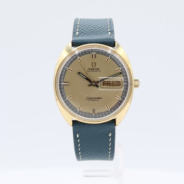 Additional Information: Day Date Function with prestine Gold Dial and Omega Gold buckle. Vintage OMEGA Seamaster Cosmic automatic wristwatch produced in the late 1960s and early 1970s. The watch is characterized by its tonneau-shaped, monocoque case design, which means the case was made from a single block of metal and opens through the dial side. The reference includes a day and date complication and is powered by the automatic Omega caliber 752 movement.