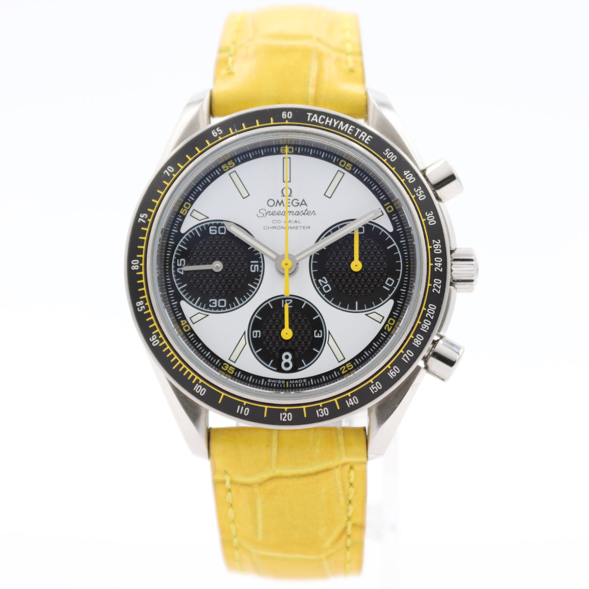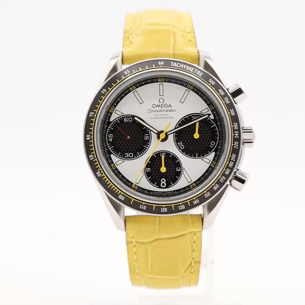 The Omega Speedmaster Racing Co-Axial Chronograph (ref. 326.32.40.50.04.001) is a 40mm stainless steel watch with a white dial and bold yellow and black accents. Its design emphasizes a sporty, high-contrast look inspired by motor racing, featuring a black aluminum tachymeter bezel and a comfortable black rubber strap. Powered by Omega's precise automatic Caliber 3330 movement, this timepiece combines robust functionality with a vibrant, eye-catching aesthetic.