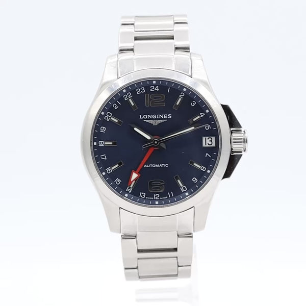 • Additional Information: The Longines Conquest GMT L3.687.4.99.6 is an elegant automatic men's watch known for its versatility as an everyday watch and a business-appropriate timepiece, featuring a GMT (Greenwich Mean Time) function for tracking a second time zone. It features a distinctive blue dial and a robust stainless steel construction.
