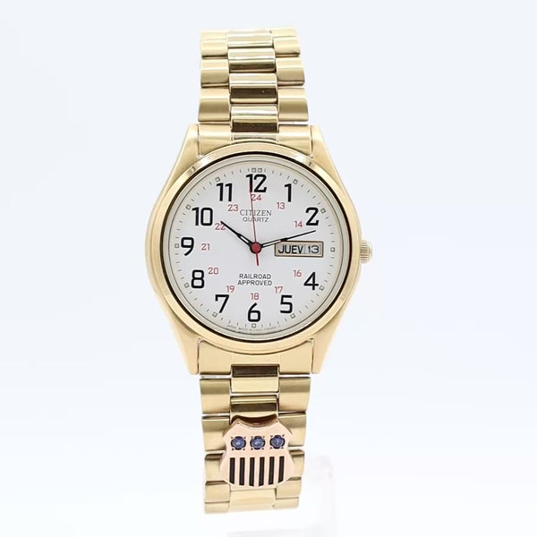 • Additional Information: The Citizen Railroad Approved Watch is a vintage (circa 1988), men's quartz wristwatch known for its classic design and specific features that qualified it for use by railroad workers. Features a Canadian Dial and Day Date function.