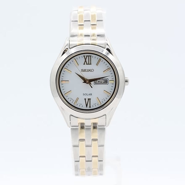 Additional Information: The Seiko V138-0AD0 is a solar-powered quartz watch that recharges from both natural and artificial light sources. It is known for its durable stainless steel construction, a simple three-hand and day date display design, and reliable performance.