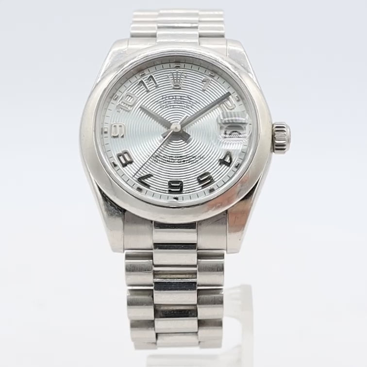 2001 K Serial full PLATINUM, Guilloche Concetric Silver Dial, Ref 178 246 Datejust. Comes in a President Bracelet is fully platinum 950PT making the piece quite hefty in weight. No box or papers but in fair condition with fair wear on the crystal, and surface swirls on the case.