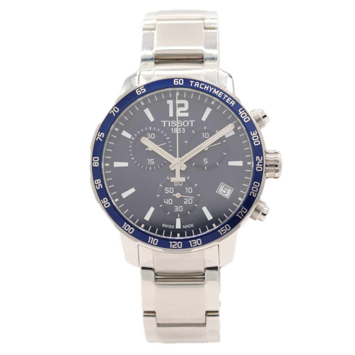 - Additional Information: With a sleek blue dial and baton indexes, this watch is both functional and fashionable, making it a great choice for everyday wear. The Tissot Quickster Chrono Blue Dial Men's Watch is a stylish sporty timepiece featuring a round silver case with a 42mm diameter, powered by a reliable quartz movement.