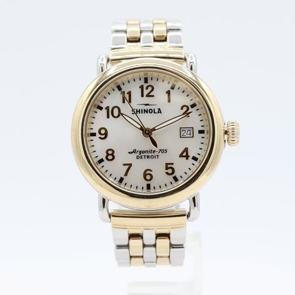 Additional Information: This watch represents a more compact and refined version of Shinola’s iconic Runwell design — a piece that can easily bridge everyday wear and dress occasions. Its polished stainless steel bracelet gives it a slightly elevated and versatile aesthetic. This model features a shimmering pearlescent dial and a date indicator.