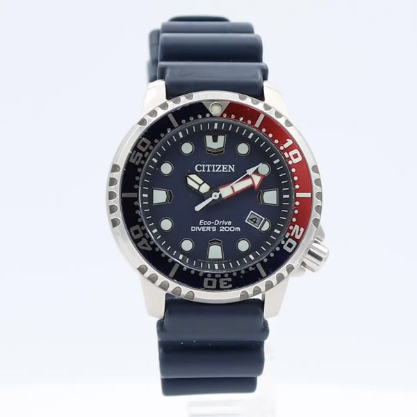 Additional Information: Divers Style Watch 200M. A Pepsi Eco-Drive, a Citizen watch that features the "Pepsi" bezel color scheme (red and blue) and Citizen's proprietary "Eco-Drive" technology, which powers the watch by converting natural and artificial light into energy, eliminating the need for a battery. These watches are often dive watches, featuring high water resistance (e.g., 200 meters), a screw-down crown, and a rotating bezel for measuring elapsed time.