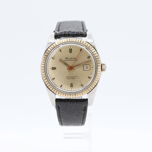 Additional Information: 10K Gold Bezel Ring. This 1970 Bulova Oceanographer reference "N-2892" is a vintage men's automatic watch, one of several Oceanographer models from the late 1960s and early 1970s. It is characterized by its automatic movement and elegant design. Water resistant up to 333 Feet.