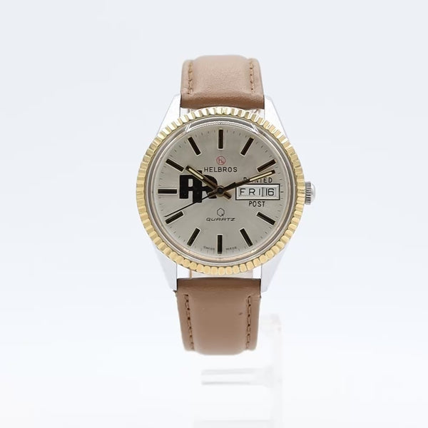 Vintage Helbros Day Date Painted Post Logo Men's Quartz Wristwatch Two ToneRuns