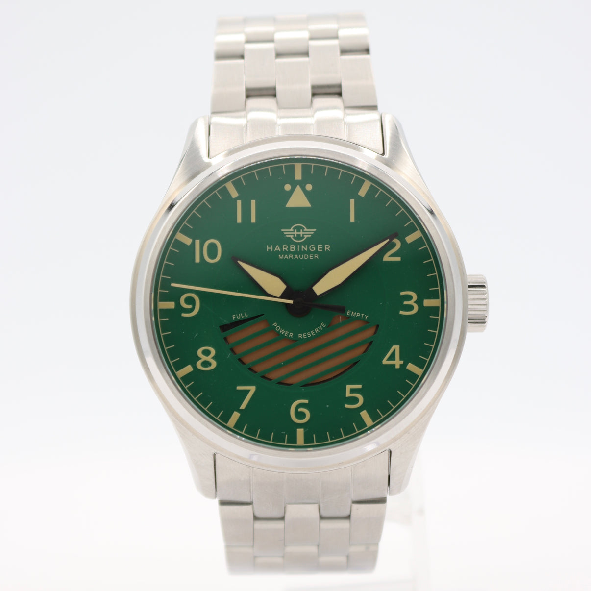 Harbinger Marauder MA4 automatic wristwatch. Features a 42 mm stainless steel case, Seiko NE57 automatic movement with power reserve indicator, sapphire crystal, and ~100 m water resistance. Modern everyday automatic with exhibition caseback and robust build.