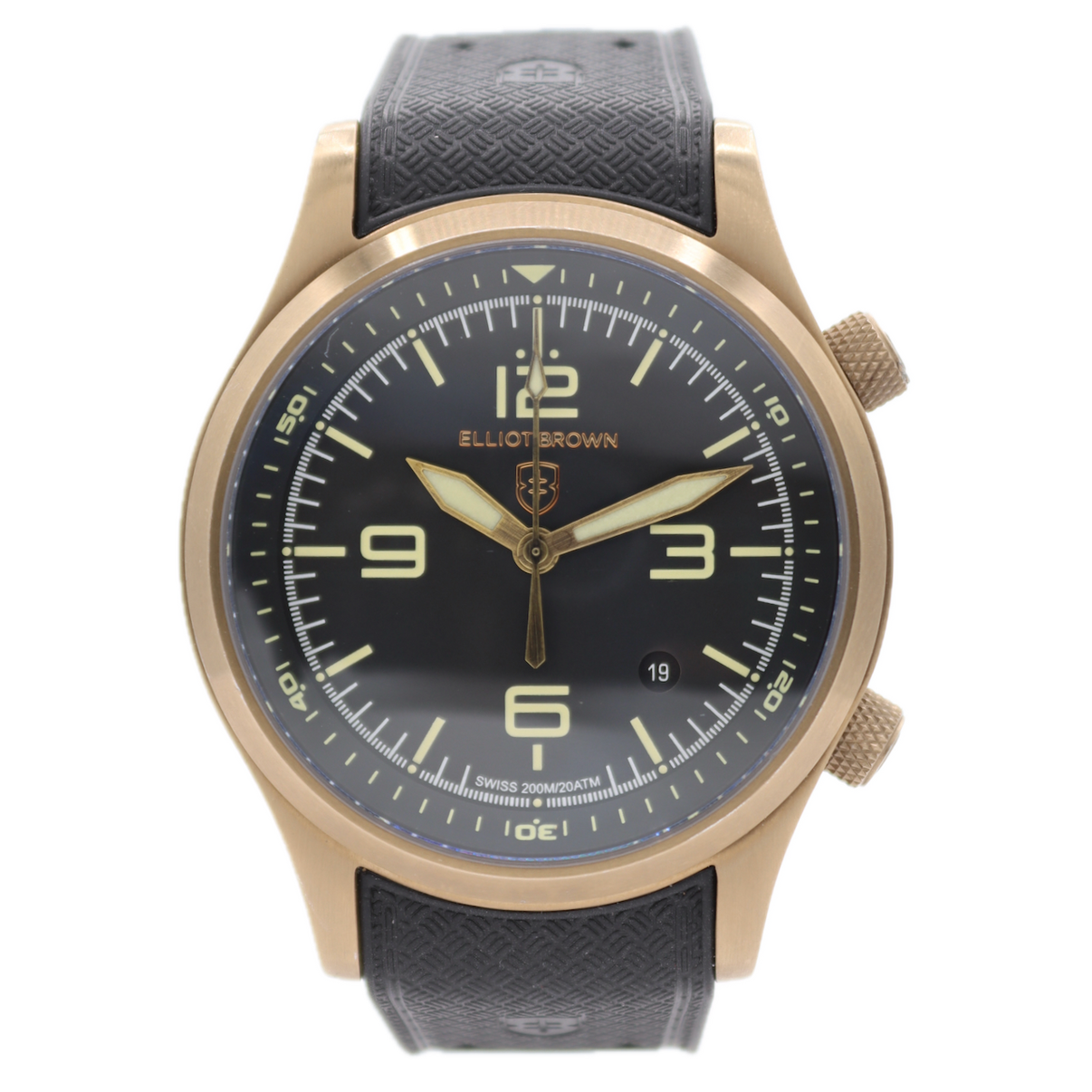 An Elliot Brown Canford 202-022-L24 featuring a black dial and gold-tone stainless steel case, combining rugged field-watch durability with refined everyday style. Powered by a Swiss quartz movement, it offers reliable, low-maintenance performance in a versatile 40mm case. With 200m water resistance and a screw-down crown, it’s built tough while maintaining a sharp, modern look. A distinctive sport watch that balances British design and practical functionality with inner rotating bezel.