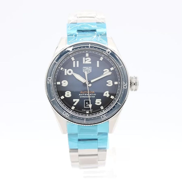 Additional Information: A rugged adventurer’s watch with heritage-styled design features true to its pioneering roots as an airplane and race-car dashboard instrument. The uncluttered, blue smoked dial is legible in even the most challenging conditions. Vintage-inspired white Super-LumiNova® lume fills the polished hands and markers. A contemporary take on the classic pilot’s watch, the Autavia comes with a stainless steel bracelet with steel folding clasp and double safety push-buttons. A broad 42mm case in hand-polished and fine-brushed steel, matched to a blue ceramic bidirectional turning bezel. The date window stands out on the clean dial design at 6 o’clock.