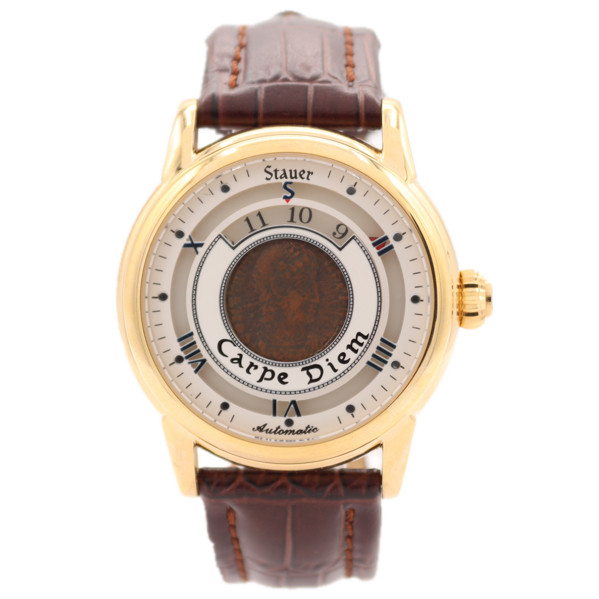 Stauer Roman Coin is a men’s automatic mechanical wristwatch featuring a distinctive antique Roman coin on the dial with