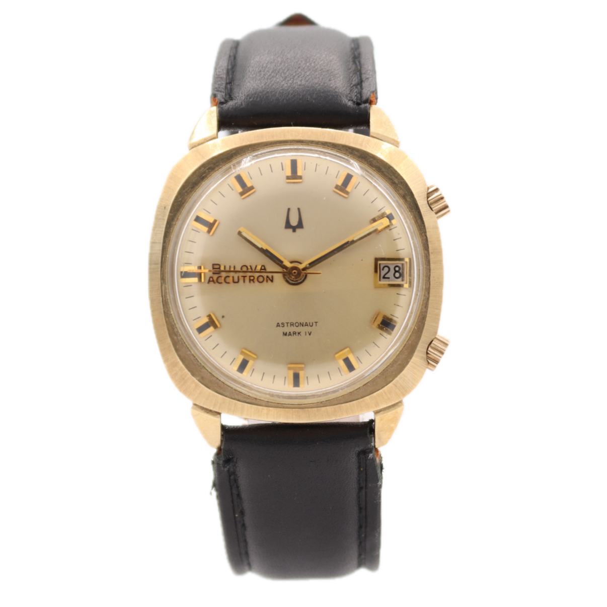 A 1972 Bulova Accutron Astronaut Mark IV wristwatch with a 14k gold-filled cushion case and caliber 2185 tuning-fork movement. This variant features a black dial with the “Astronaut Mark IV” label and a fixed bezel, offering the precision and smooth sweep unique to Accutron tuning-fork technology. A rarer dress-oriented take on Bulova’s iconic Astronaut line, blending aerospace-inspired heritage with refined gold-filled styling. A collectible and distinctive vintage Accutron for enthusiasts and collectors alike.