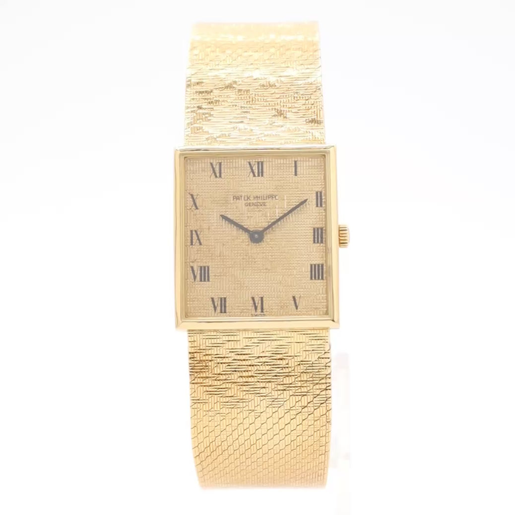 The Patek Philippe Reference 3550/1 is a vintage, extra-thin, rectangular wristwatch, primarily found in 18K yellow or white gold, featuring a manual-winding mechanical movement and an integrated mesh bracelet. It was produced circa the late 1960s to early 1980s.
