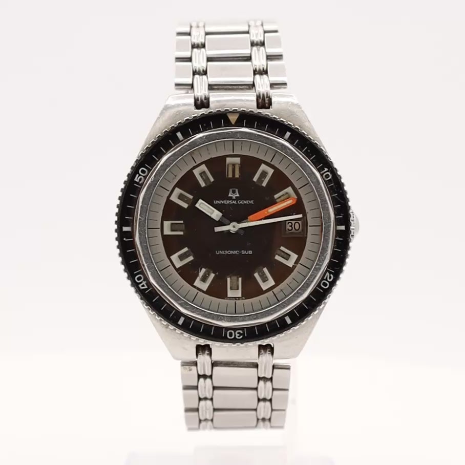 Universal Genève Unisonic-Sub 852103 is a rare, vintage luxury diving watch produced around the late 1960s. It is a highly sought-after collector's item known for its unique tuning fork electro-mechanical movement. Comes with an original, integrated stainless steel Gay Frères multi-link bracelet.