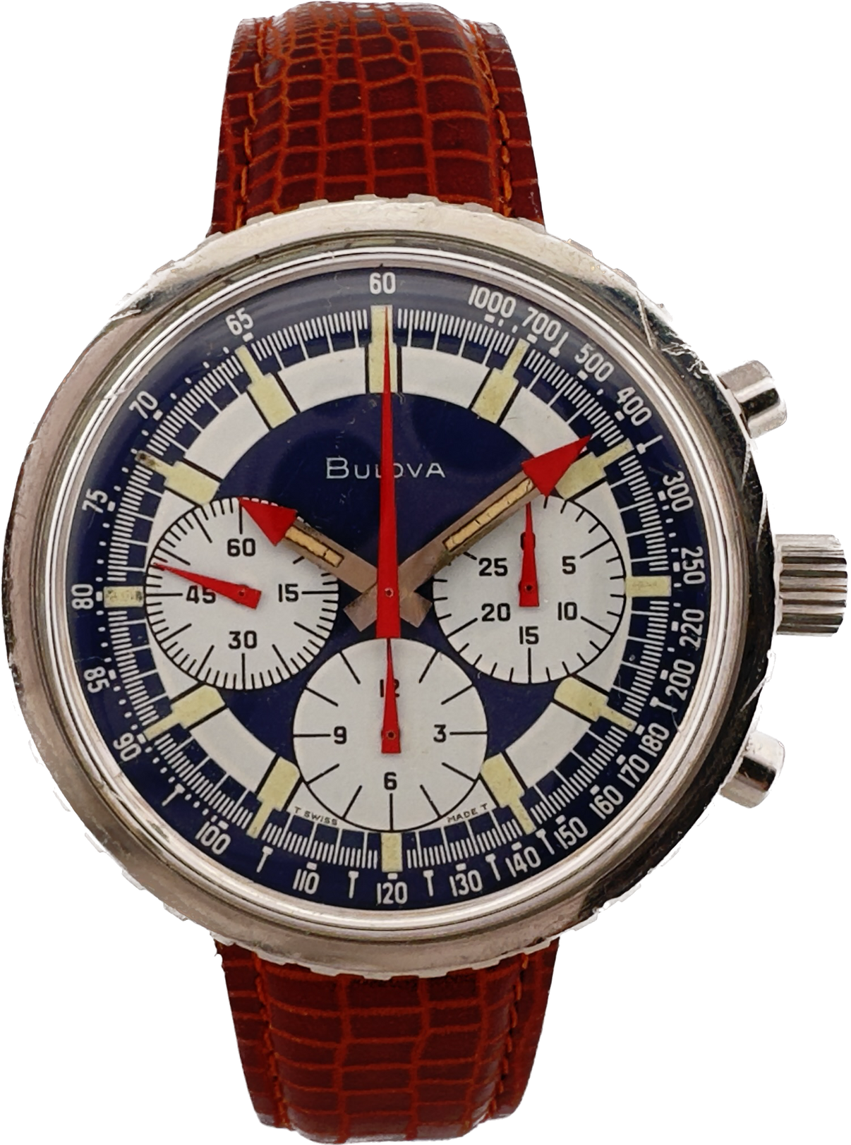 The formal name from Bulova for this 1970 watch is Chronograph C. It is much more commonly known as the Stars and Stripes. One look at this dial and you where the name came from. It is a great mixture of red, white, and blue. The case is huge for the time at 43mm in diameter. The case size is one aspect that fits more modern tastes but was oversized for the era. This is powered by a Valjoux 7736, the chronograph has the second, minute, and hour counter. It shows normal signs of wear for its age with scratches on the case. The crystal is not original causing there to be a little space between it and the dial. This is causing just a slight bit of rattle from the movement moving around inside the case. This has been recently serviced and the chronograph functions great.