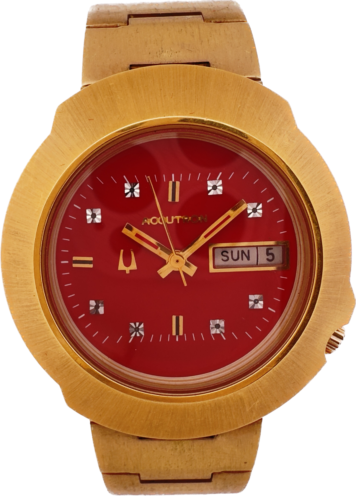 The 1970s Accutrons tended to be really chunky, which was common for many watches of that era. This is no exception, the dial color gives it a bit of elegance. The wine red color fits the 70s but lacks the bright even many times neon colors of the era. This has a US-made caliber powering it 218 2. This particular chunky case model is 852-1. It has a stainless steel back with a brushed-finished gold-plated bezel. I don't have the service history but it is keeping time.