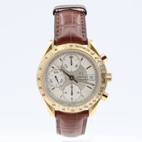 Additional Information: Comes with Box, Documentation and Operating Instructions. This Omega ref. 3613.30.02 is a Speedmaster Date model featuring a 39mm yellow gold case, a silver dial, and an automatic movement (Caliber 1152). It includes chronograph functions, a 46-hour power reserve, and a tachymeter bezel. This watch combines the sporty heritage of the Speedmaster with a luxurious yellow gold case and a more practical, everyday-wearable design with its automatic movement and date function.