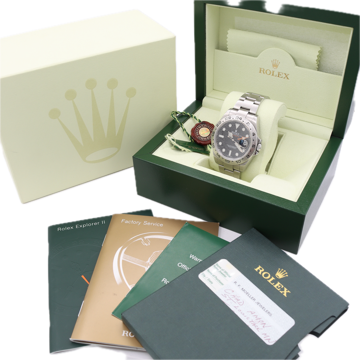 Single owner 2010 Serial Explorer 2 black dial will full kit. Shows consistent signs of wear with surface scratches throughough, and some slighly larger dings on the case and edges of crystal. There is a very faint scratch on the dial between 6 and 9. Running within spec at -1 second a day with 291 amplitude.