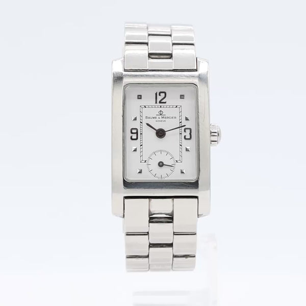 Additional Information: The Baume & Mercier MV045139 is a ladies's Hampton collection watch with a stainless steel case, a rectangular white dial with an analog display, and a quartz movement. Key features include a sapphire crystal, water resistance up to 30 meters, and a stainless steel bracelet with a hidden butterfly clasp