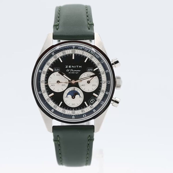 • Additional Information: The Zenith 03.3400.3610 is a Chronomaster Original Triple Calendar watch featuring a 38mm stainless steel case, a forrest green dial, and the El Primero 3610 automatic movement. It includes a chronograph with 1/10th of a second precision, a moon phase, and a triple calendar for the day, date, and month. The watch has a 60-hour power reserve and is water-resistant up to 50 meters.