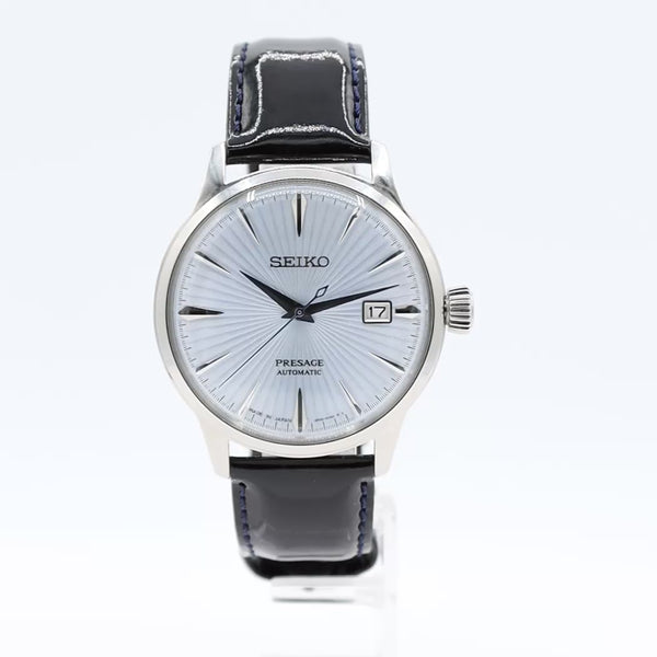 • Additional Information: The Seiko SRPE19, also known as the Presage "Cocktail Time Skydiving," is a men's automatic dress watch featuring an eye-catching light blue and textured dial. It combines classic design elements with reliable mechanical watchmaking from Japan. This model features a skeleton case back.