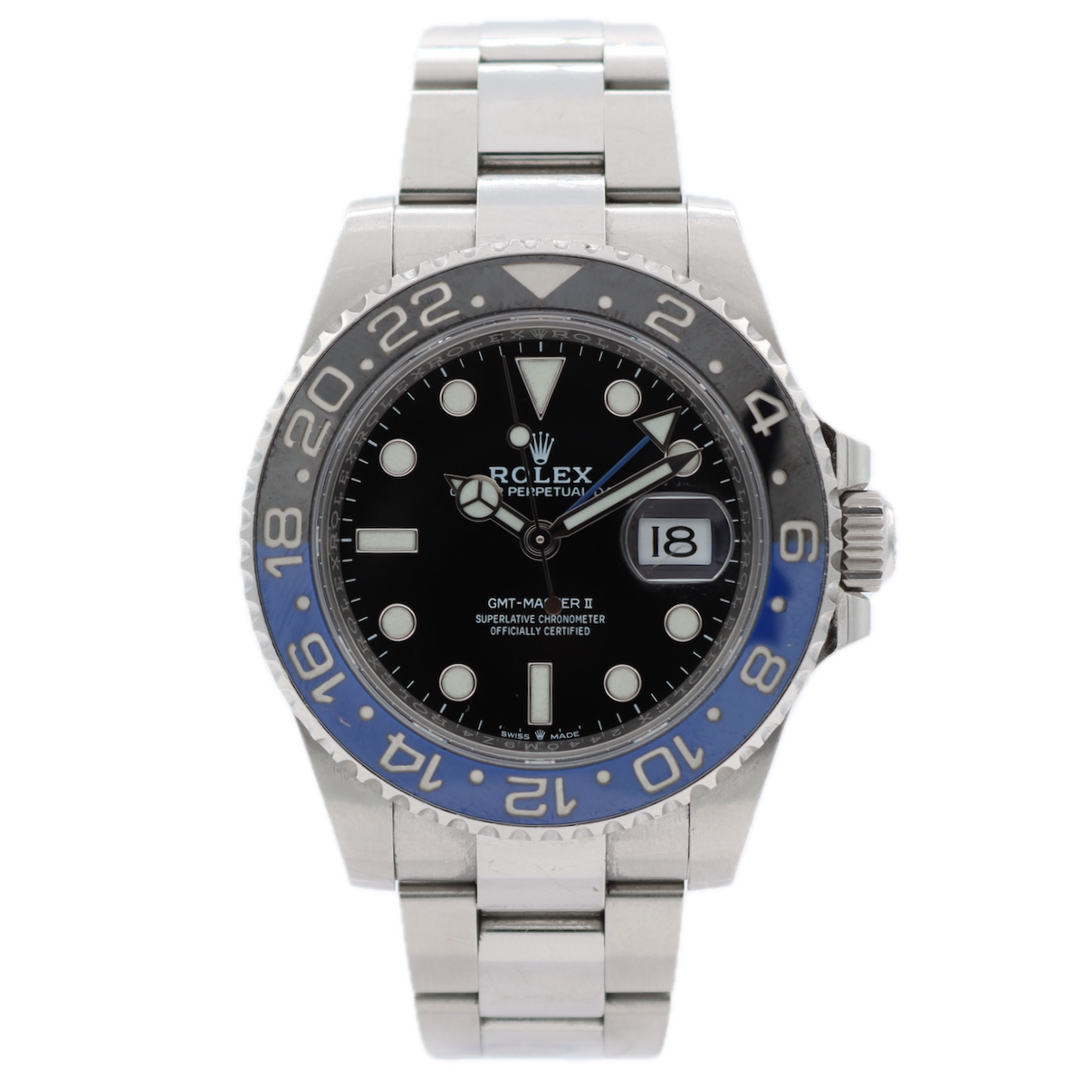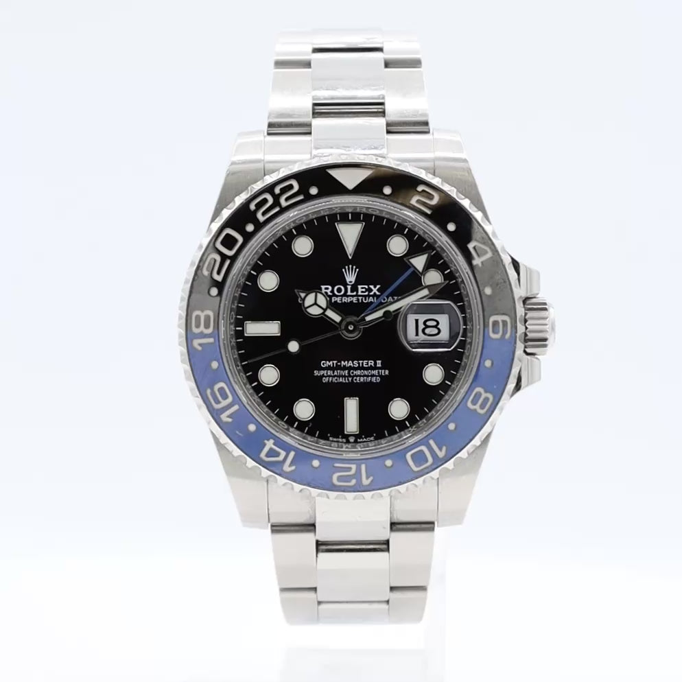 - Additional Information: Rolex GMT-Master II 126710BLNR combines classic Rolex design with modern watchmaking. Key features include a 40mm Oystersteel case, a bidirectional black and blue Cerachrom ceramic bezel for tracking a second time zone (blue for day, black for night), and a black lacquer dial with Chromalight luminescence. The watch is powered by the Rolex Caliber 3285 movement with a 70-hour power reserve and is waterproof up to 100 meters. This model features Oyster ("Batman") bracelet, Oysterlock clasp and Easylink extension.
