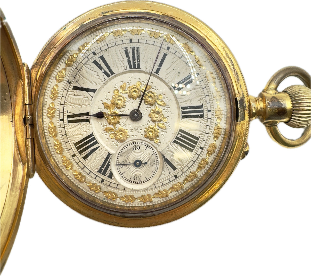 Ok, overall condition for its age. Running, but it will need serviced. This means, it can run unreliably, start or stop and timekeeping is not guaranteed. There is plating wear through and scratches on the case. There are scratches on the crystal. The hunter lid functions correctly.
