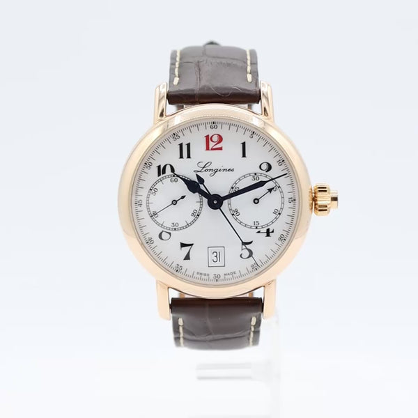Additional Information: With Box and User Manual, No.253. The Longines L2.775.8.23.3 is an 180th Anniversary limited edition watch from the Heritage collection, featuring an 18k gold case, a white lacquered dial with black Arabic numerals and a red "12", and a single-pusher column-wheel chronograph. It is powered by the Longines Caliber L788 automatic movement, has a 40mm diameter, a brown alligator-patterned leather strap, and is water-resistant to 30 meters.