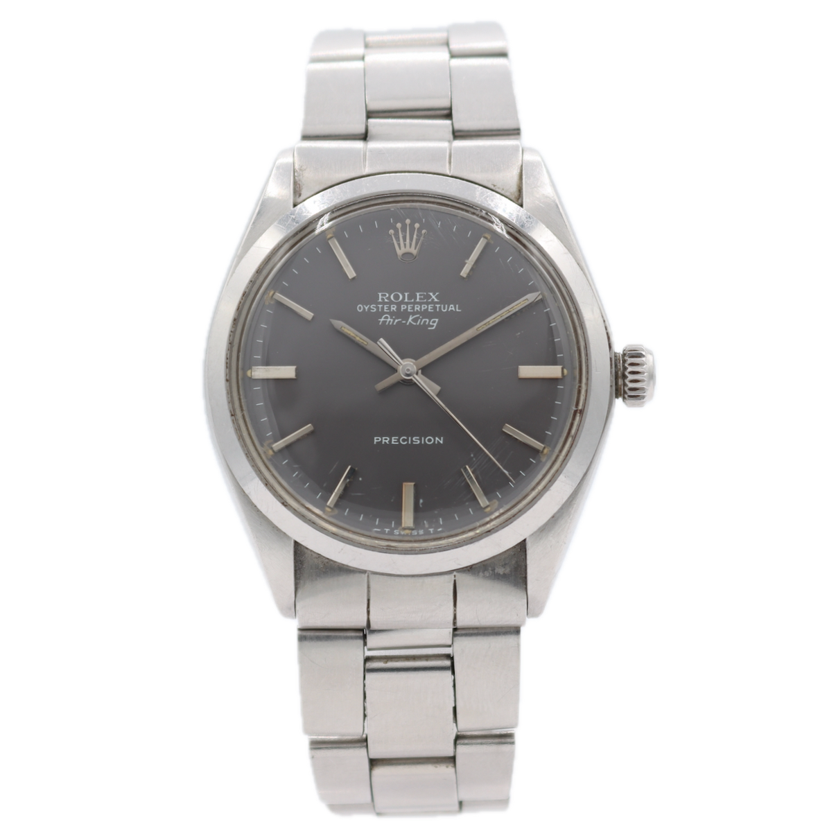 Additional Information: Produced in 1975 this Rolex Air-King ref. 5500 is a vintage, self-winding wristwatch, known for its simple, classic design and 34mm Oyster case. It is a time-only watch, lacking complications like a date display, which contributes to its understated and versatile style.