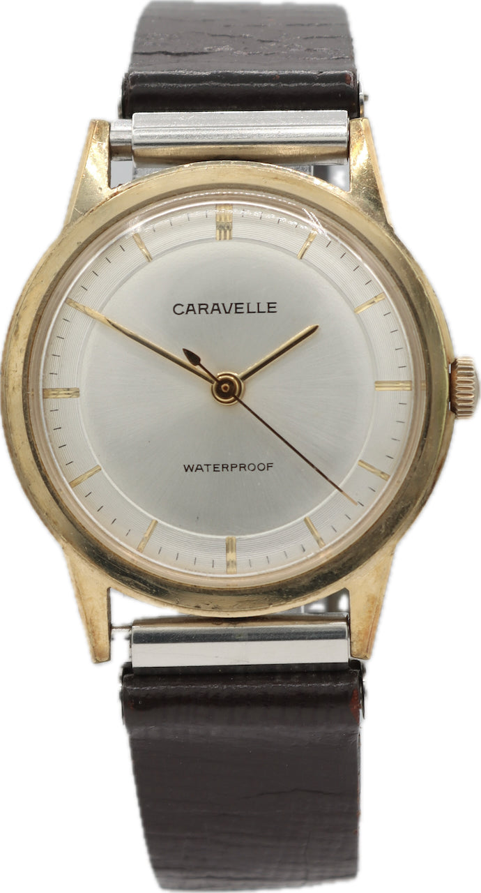 Good, overall condition for its age. Running, but we dont know the last time it was serviced. This means, it can run unreliably, start or stop and timekeeping is not guaranteed. There are scratches on the case. There are scratches on the crystal. The band is not original. Vintage caravelle with very clean dial. Faint marks on are the crystal near 12, and the case shows light signs of wear. Overall running well with strong amplitude and gaining less than a minute a day.