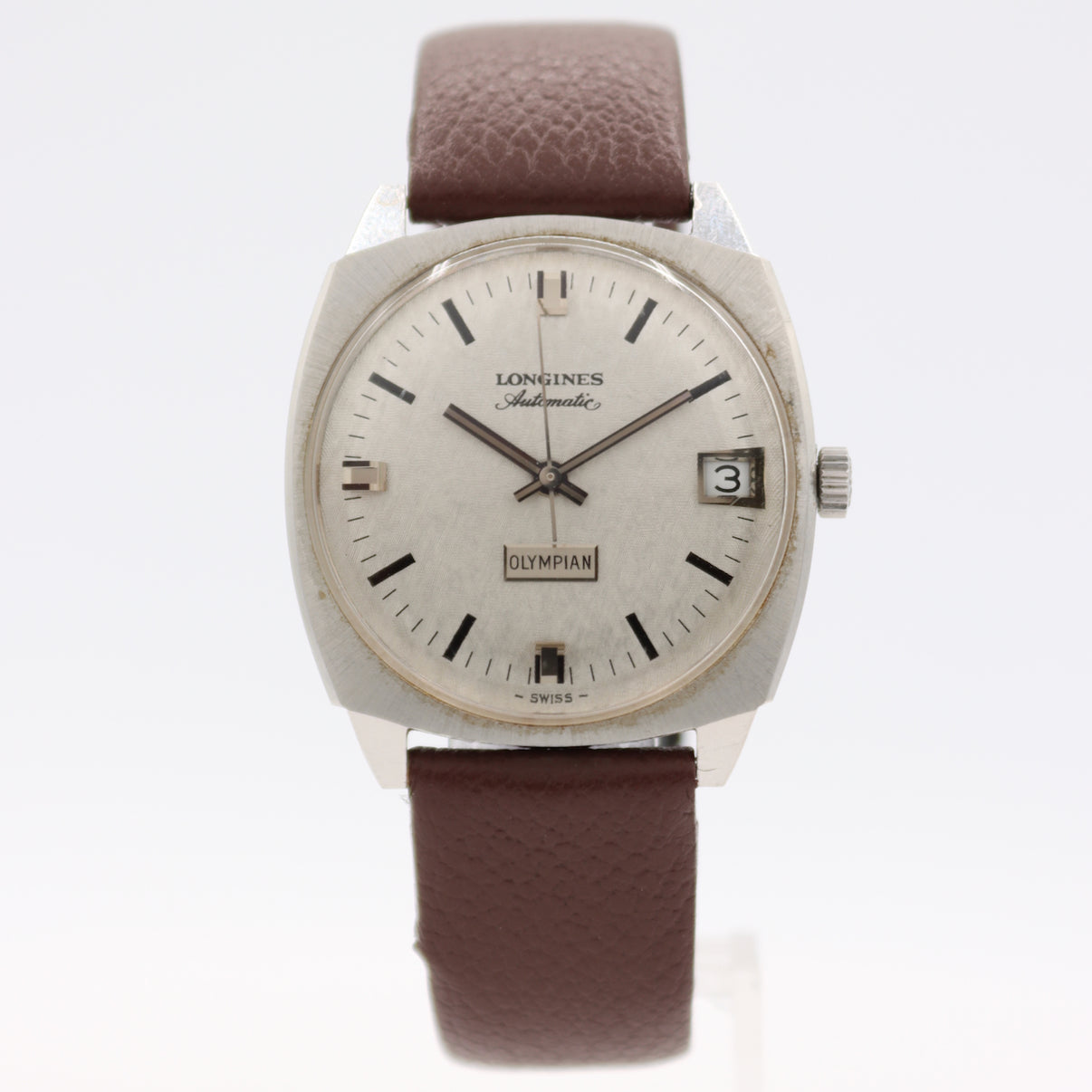 Additional Information: Longines Olympian automatic wristwatch, reference 637.932. Swiss-made self-winding movement with classic mid-century design, combining sporty elegance with Longines’ renowned reliability.