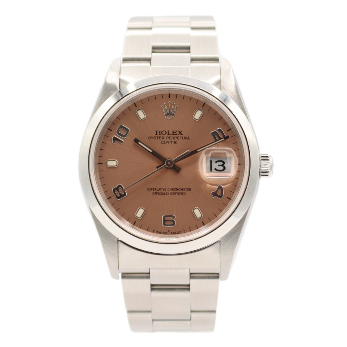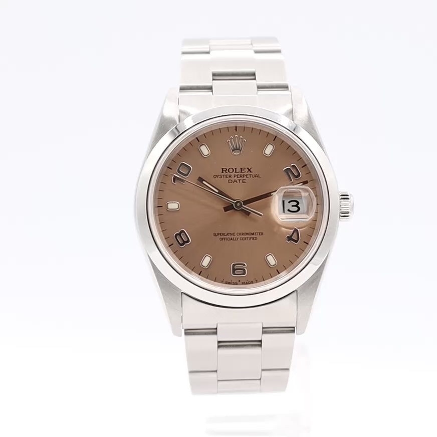 The Rolex 15200 is a 34mm stainless steel Oyster Perpetual Date watch known for its versatile design, featuring a smooth bezel, Oyster bracelet, and often a distinct salmon-colored dial, especially with Arabic numerals, making it a popular.