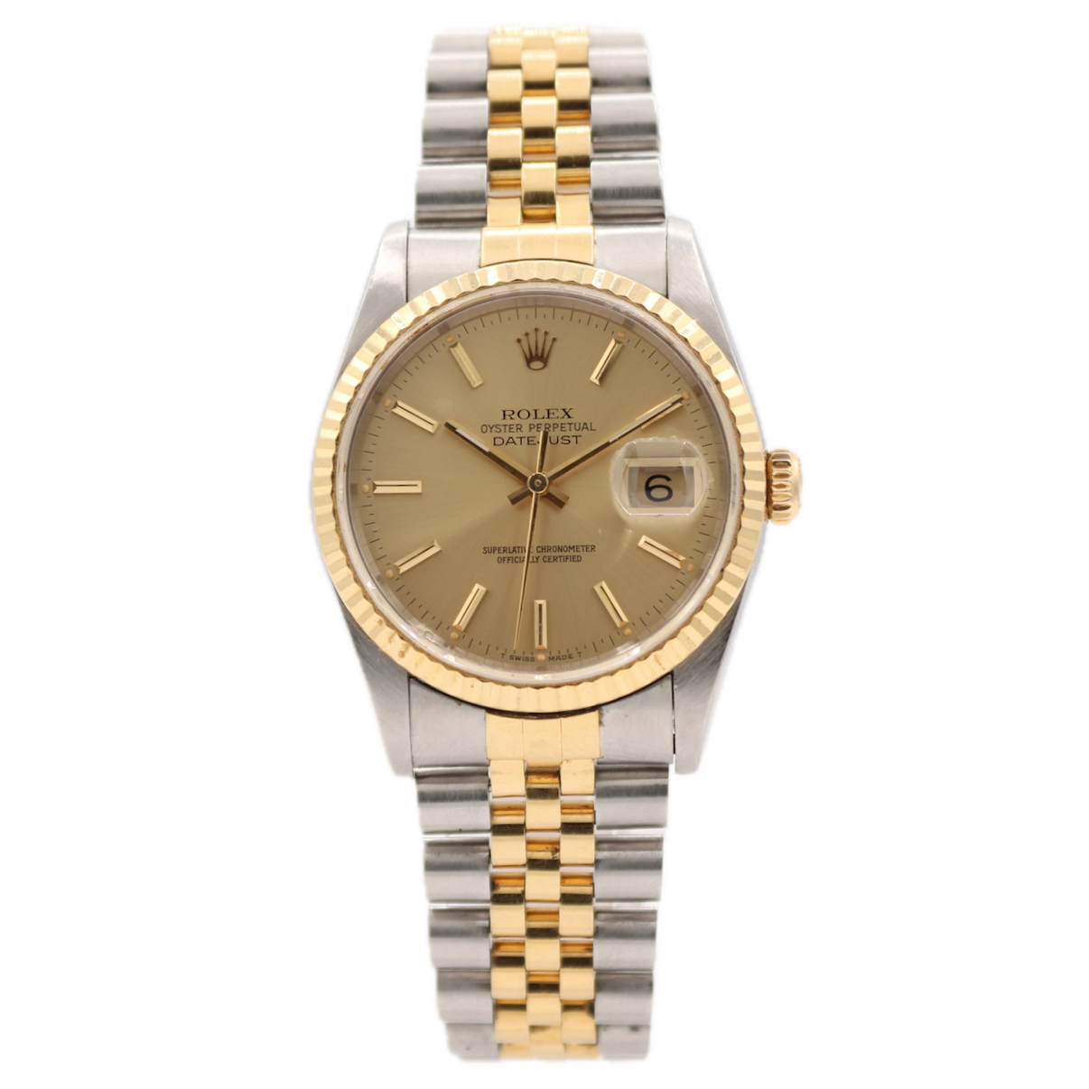 Additional Information: The Rolex 16233 is a classic two-tone (stainless steel and 18k yellow gold) Datejust model, famous for its 36mm case, fluted gold bezel, Jubilee bracelet, and robust Calibre 3135 movement, produced from the late 1980s into the 2000s, marking a significant upgrade to a sapphire crystal over previous acrylic versions, and remains a popular, versatile timepiece