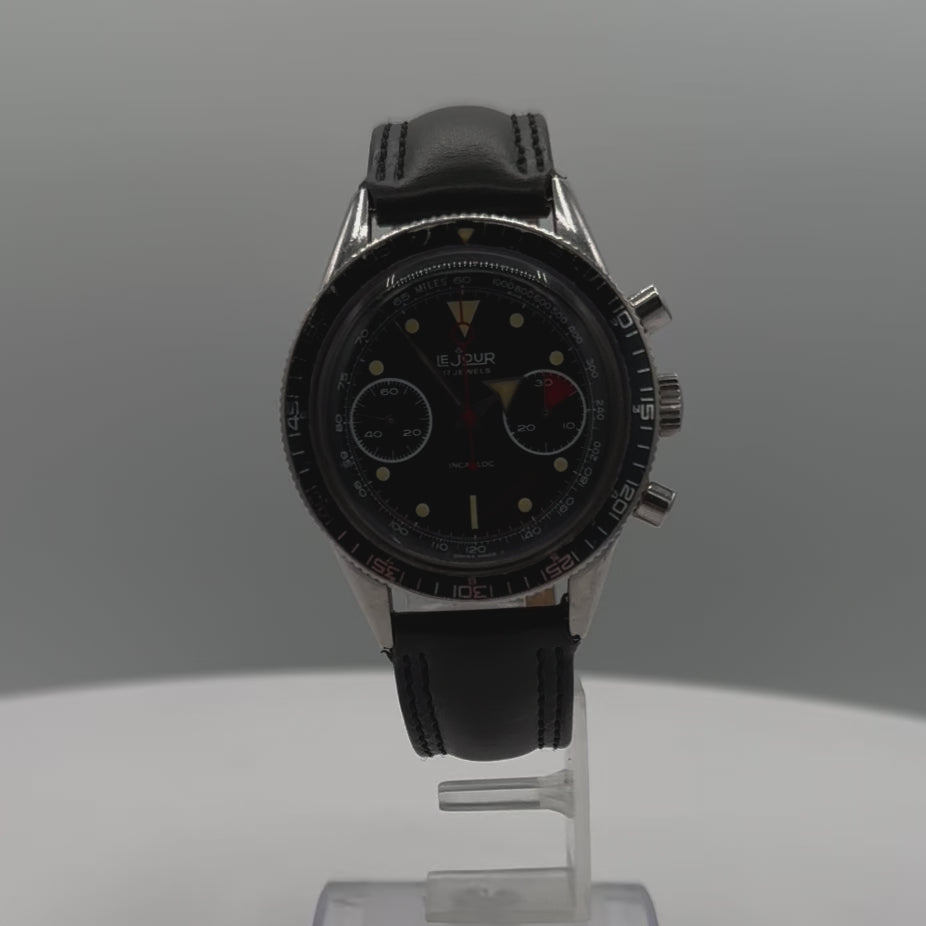 Good, overall condition for its age. Running, but we dont know the last time it was serviced. This means, it can run unreliably, start or stop and timekeeping is not guaranteed. Gaining 2 seconds a day, 269 amplitude, 1.2 beat error. There are scratches on the case. There are scratches on the crystal. The band is not original. Stylish LeJour in overall good condition and keeping decent time. Lume plot on lollipop hand has fallen out but the rest of the dial is very clean.