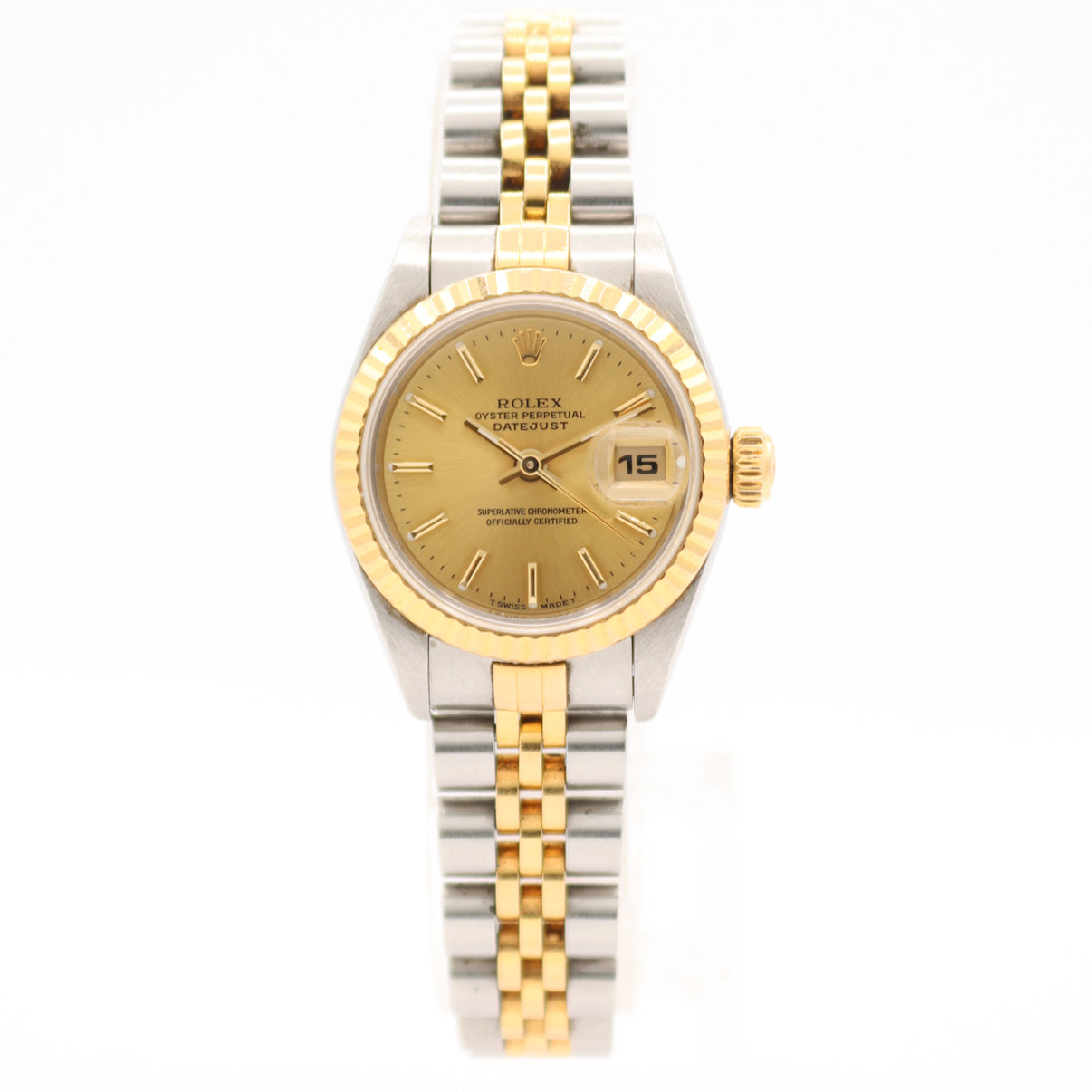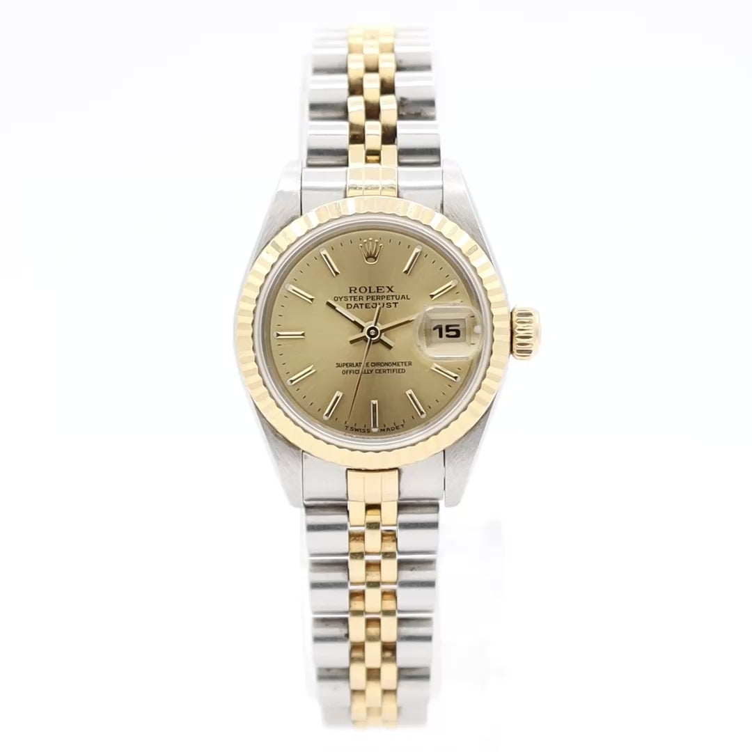 The Rolex Lady-Datejust 69173 is a quintessential 26mm luxury watch from the 1990s, featuring a two-tone 18k yellow gold and stainless steel construction. It typically includes a fluted bezel, sapphire crystal, and a Jubilee bracelet. Powered by the automatic Caliber 2135 movement, it offers a quickset date and is favored for its classic, versatile design suitable for daily wear.