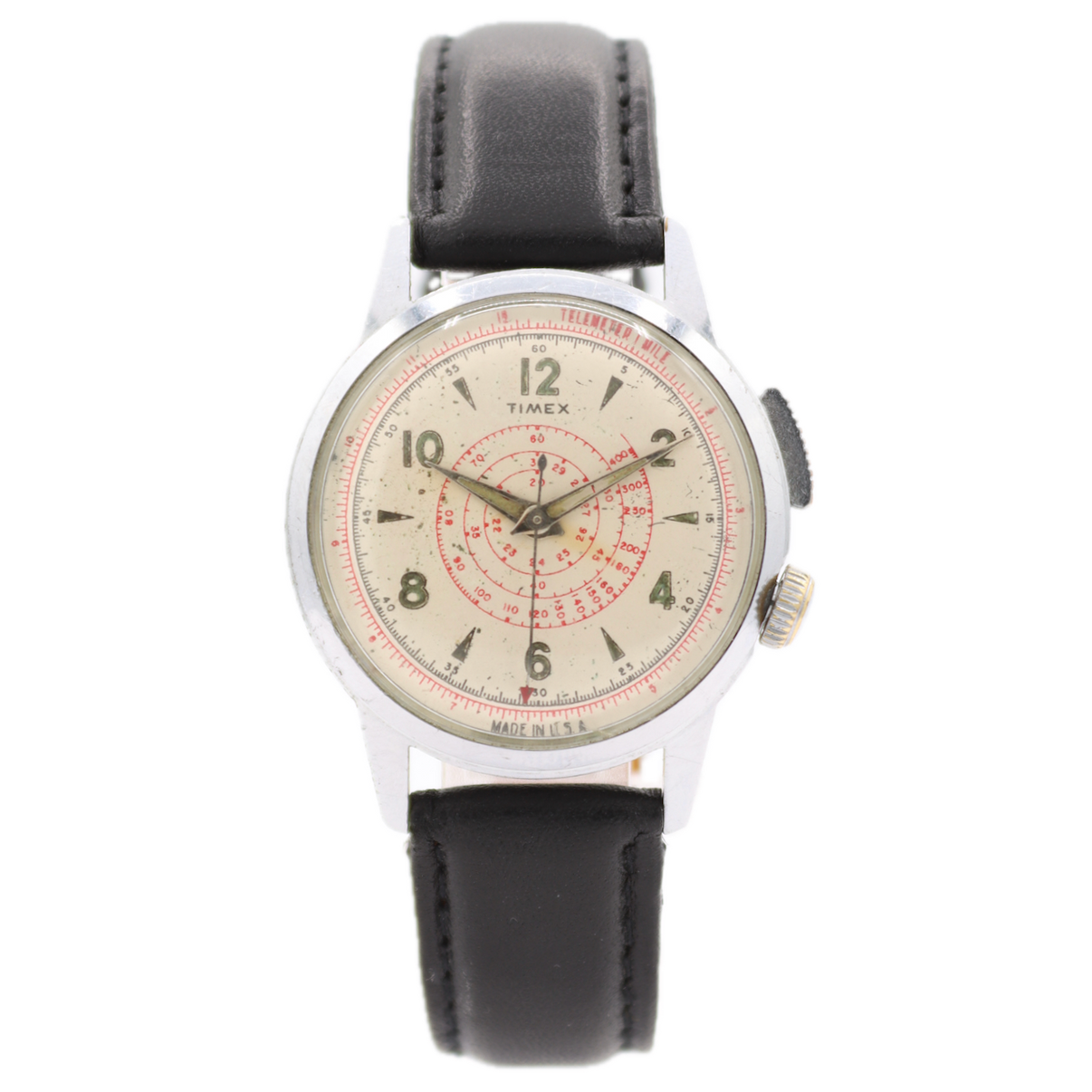 Vintage Timex mechanical wristwatch with time-only movement and unique spiral telemeter scale on the dial. The spiral markings with numbered ticks allow measurement of distance to events that are both seen and heard (e.g., thunder vs lightning) based on the speed of sound. Mid-century Timex piece with distinctive instrument style and practical dial functionality.